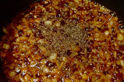 Добавить тмин, тушить 1 - 2 минуты, постоянно помешивая.